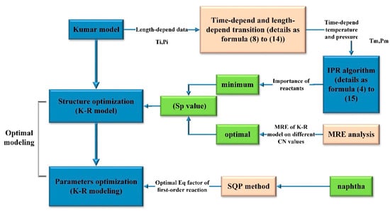 In the first part of structure optimization, in order to acquire the minimum Sp value, the importance of substances mentioned in the Kumar model (Table 3) should be calculated. So, a common Kumar model is established first. Then, an improved search engineering algorithm Improved PageRank (IPR) is employed to calculate importance of mentioned substances (Table 3). The IPR algorithm need time-depend temperature and pressure, so the length-depend data are transferred into time-depend ones. A criterion is set to ensure the Sp value covers important parts of the reaction network. After that, an MRE calculation is carried out to find the optimal Sp value. Actually, this step traverses every possible Sp value to find the structure of the minimum product yield error.