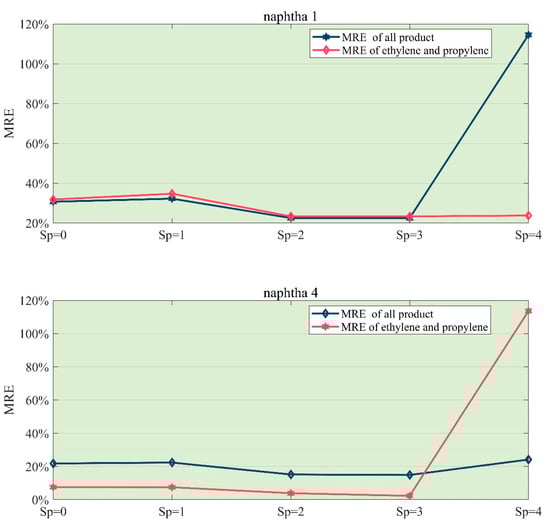 From Table 13, we find the error is mainly in propylene, ethylene, and propylene (error > 10%). The product yield of ethylene is undersized and that of propylene is oversized. This is the same with the phenomenon in Zhang’s experiment. In this way, the conclusion can be derived that the reason for the different performance of the two models is that, in these feedstocks, the amount of i-butane is greater.