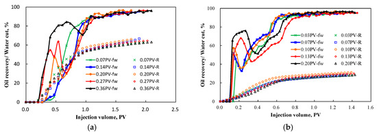 - A post-waterflooding is carried out at a flow rate of 1.0 mL/min till the instantaneous water cut reaches 95%. Throughout the displacement test, a 10 mL glass tube is used to collect the effluent every 5 min.