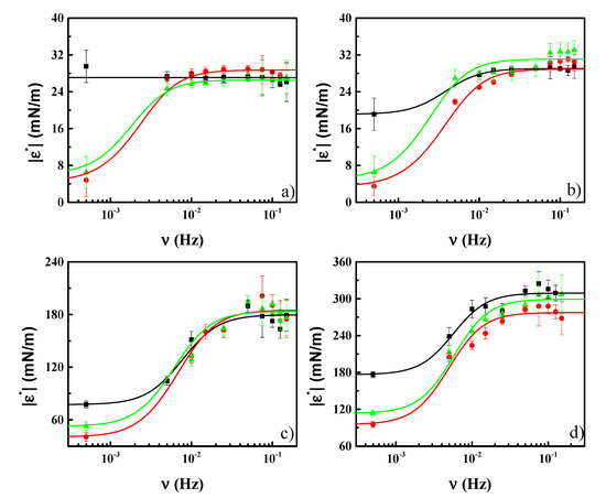 - Bykov, A.G.; Noskov, B.A. Surface Dilatational Elasticity of Pulmonary Surfactant Solutions in a Wide Range of Surface Tensions. Colloid J. 2018, 80, 467–473. [Google Scholar] [CrossRef]