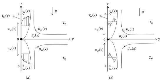 Here, a and b are constants, is the characteristic magnetic field, n functions as the positive constant, s is the suction parameter, and is the constant characteristic temperature, with signifying a cooled surface (opposing flow) and corresponding to a heated surface (assisting flow).