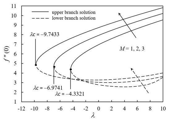 Table 4 presents the results of the stability analysis, where the smallest eigenvalues were identified for the respective values of the governing parameters. The sign of the smallest eigenvalue (γ1) is vital in deciding the stability of the solutions. For instance, a positive smallest eigenvalue conveys a stable solution, which explicates the stabilizing property of the solution to overcome the given disturbance. Meanwhile, the negative smallest eigenvalue illuminates the unstable numerical solution that indicates the growth of the disturbance. Usually, the unstable solutions lead to flow separation. Therefore, from Table 4, it can be concluded that the upper branch solution is stable while the lower branch solution is unstable. Figure 2 demonstrates the behavior of the skin friction coefficient, f″(0), as M varies from 1 to 3 concerning λ. The upper branch solution and the lower branch solution (within the range of λ > 0) in Figure 2 convey that there is an increment in f″(0) when M increases from 1 to 3. The increment of M in the electrically conducting fluid (water) forms the Lorentz force, which reduces the flow motion. However, the velocity profiles in Figure 3 reflect that the velocity of the upper branch solution increases as M increases. The interaction between the suspended magnetic nanoparticles with the magnetic field in the fluid flow vicinity may result in an enhancement in the fluid velocity during shrinking. The increment in the fluid velocity increases the velocity gradient, which then increases the wall shear stress along with the shrinking sheet, and promotes the values of f″(0). On the other hand, the lower branch solution in Figure 2 shows the opposing behavior in the region of the opposing flow (λ < 0), where there is a decrement in f″(0) when M increases from 1 to 3. The velocity profiles in Figure 3 also display that the velocity of the lower branch solution in the region of opposing flow decreases. The reduction in the fluid flow essentially indicates the flow separation is about to happen. The plotting in Figure 2 elucidates that the dominancy of the magnetic field in the fluid flow manages to delay the flow separation and help to elongate the laminar flow.