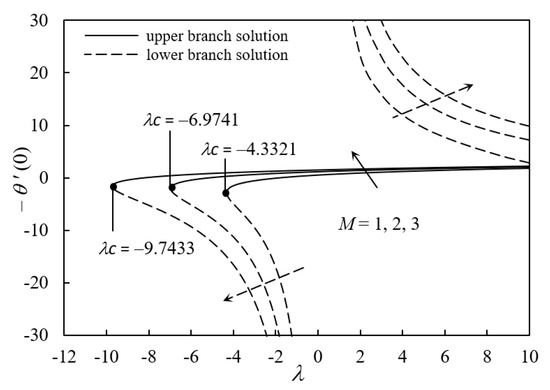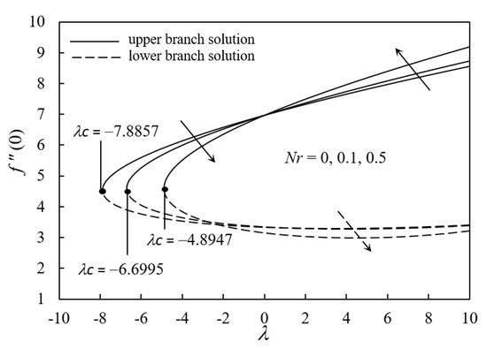 Figure 8 exposes the performance of −θ′(0) for λ as Nr varies. The upper branch and lower branch solutions signify that the value of –θ′(0) declines as Nr increases. The stronger impact of the thermal radiation increases the fluid temperature within the boundary layer region because the rate of conduction heat transfer is enhanced at the surface of the sheet. The temperature profiles in Figure 9 support this fact, where the ferrofluid temperature increases when Nr increases. Consequently, the thermal conductivity increases and this results in the decrement in the rate of convective heat transfer.