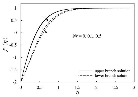 Figure 4 demonstrates the behavior of the local Nusselt number or −θ′(0) with respect to λ as M varies. Both solutions express that an increment in the values of M improves the rate of heat transfer past the permeable shrinking sheet. When the strength of the magnetic force becomes stronger, it attracts more magnetic nanoparticles at the surface of the shrinking sheet and reduces the thermal conductivity of the fluid. This fact is in accordance with the temperature profiles as in Figure 5, where the ferrofluid temperature decreases when M increases. Consequently, the rate of convective heat transfer increases when M increases. Figure 6 overviews the trend of f″(0) as the radiation parameter (Nr) varies in the opposing and assisting flow cases. The upper branch and lower branch solutions depicts that there is a depreciation in f″(0) when Nr increases in the vicinity of the opposing flow towards the permeable shrinking sheet. The greater impact of the thermal radiation in the opposing flow was found to decrease the fluid flow (see velocity profiles in Figure 7) and reduces the wall shear stress along with the shrinking sheet. Eventually, the value of f″(0) declines and a stronger influence of Nr quickens the flow separation. However, in the region of assisting flow (λ > 0), the value of f″(0) is enhanced, and this may occur because of the buoyancy force, which helps to accelerate the fluid flow past the shrinking sheet.