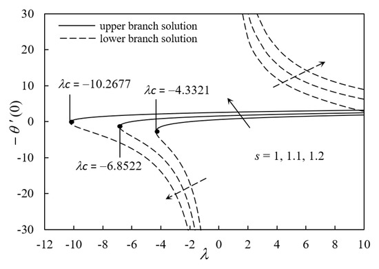 Figure 10 and Figure 11 illustrate the behavior of f″(0) and –θ′(0) for λ when s varies, respectively. The upper branch solution identifies an increment in f″(0) in the opposing flow region over a shrinking sheet. The state of opposing flow, where the direction of the fluid flow is opposed with the direction of the gravity, increases the wall shear stress of the shrinking sheet and that results in the rise of f″(0). However; the lower branch solution views the decrement in f″(0) as the intensity of suction increases. This trend may postulate the flow with separation, where the formation of small wake might reduce the wall shear stress along with the shrinking sheet. Hence, the values of f″(0) decreases. Figure 10 also indicates that as the strength of the suction increases, the flow separation is delayed. The permeable sheet helps to sustain the laminar flow by trapping the slow-moving molecules along with the shrinking sheet. As a result, the wall shear stress at the surface of the sheet increases and postpones the flow separation. Figure 11 exhibits the trend of the rate of heat transfer as s varies across the assisting and opposing flow, respectively. The upper branch and lower branch solutions show that the value of –θ′(0) increases when s increases. When the value of s increases, it increases the permeability of the sheet, where it allows more ferrofluid to diffuse the sheet. Then, the higher thermal conductivity of ferrofluid increases the heat flux at the shrinking sheet. Consequently, the rate of heat transfer is enhanced when s increases.