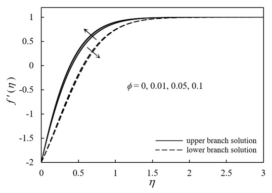 Figure 12 shows the velocity profiles when the solid volume fraction () varies past the permeable shrinking sheet in the opposing region. The velocity profiles indicate that, for the upper branch solution, there is an increment in the fluid velocity when increases. When more magnetic nanoparticles present in the MHD influence the fluid flow, the fluid velocity will increase. However, the lower branch solution hints that the fluid velocity decreases when increases. This contradicts the trend implying flow separation and can be assumed as an early indication of the occurrence of the flow separation. Figure 13 portrays the temperature profiles when the solid volume fraction () varies past the permeable shrinking sheet in the opposing region. Both numerical solutions convey that the fluid temperature increases when the value of increases. The better thermal conductivity property of the magnetic nanoparticles contributes to the thermal enhancement of the ferrofluid past the permeable shrinking sheet.