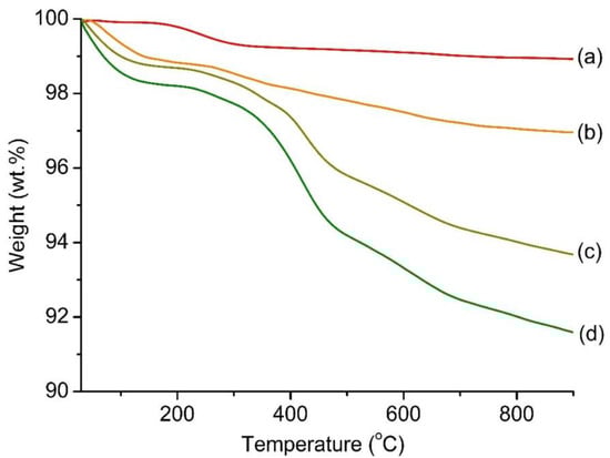 TG curves of as-synthesized (a) CP-0, (b) CP-0.3, (c) CP-1.0, and (d) CP-2.0.