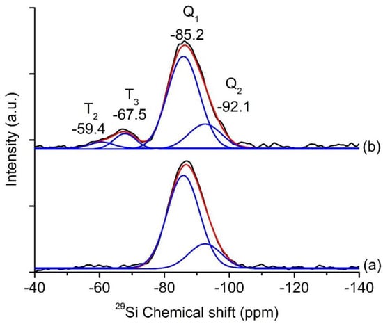 In order to confirm that TPOAC was chemically bound to the Cs–pollucite framework, as-synthesized CP-0 and CP-2.0 were selected and characterized with 29Si MAS + DEC NMR spectroscopy. For CP-0, a broad signal is shown in the range of −72.9 to −104.1 ppm, where this band is due to the Q1: Si(OAl)4 and Q2: Si(OSi)(OAl)3) species originating from the Cs–pollucite framework (Figure 2a) []. On the other hand, CP-2.0 also exhibits the same NMR band at this region and a weak additional broad peak is also observed from −55 to −75 ppm, where this peak is contributed by the Tn species (Tn = RSi(OH)3−n, n = 2 and 3) of TPOAC (Figure 2b) []. Thus, it demonstrates that the TPOAC organosiloxane was chemically connected to the Cs–pollucite framework.