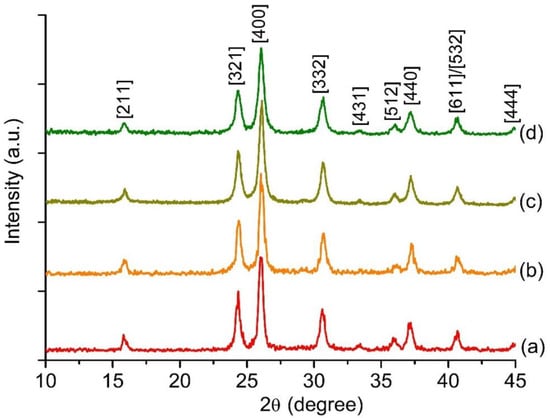 The as-synthesized CP-0, CP-0.3, CP-1.0, and CP-2.0 were calcined and the XRD patterns of the respective samples are shown in Figure 3. It can be seen that all calcined samples display XRD patterns similar to that reported in the literature (JCPDS card no. 29-0407), revealing that Cs–pollucite with an ANA framework structure was obtained []. In addition, the XRD peaks’ intensity (e.g., the [321], [400], and [332] peaks) of the samples decreased when more TPOAC was used, thus indicating that the addition of TPOAC interrupted the crystallization process of Cs–pollucite. The XRD peaks of the samples (e.g., [321], [400], [332], and [440] peaks) also broadened when TPOAC was added. Such a phenomenon can be explained by the reduced crystallite size []. The crystallite size of Cs–pollucite samples was calculated using the Scherrer equation. It is shown that CP-0 has a crystallite size of 66.94 nm and the size decreases to 55.20 (CP-0.3), 33.37 (CP-1.0), and 31.57 nm (CP-2.0).
