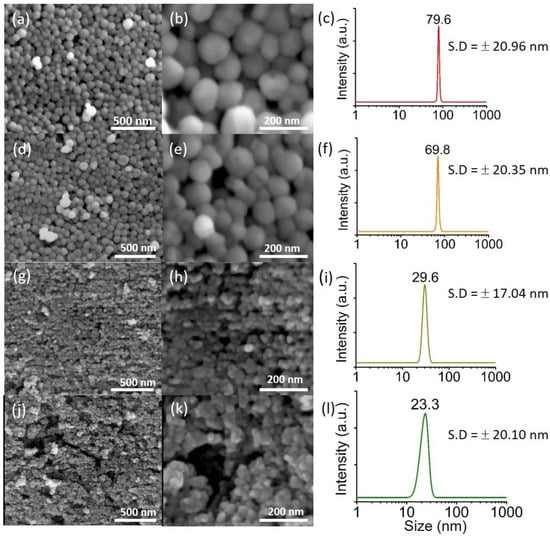 FESEM and particle size distributions (with standard deviation, S.D) of calcined (a–c) CP-0, (d–f) CP-0.3, (g–i) CP-1.0, and (j–l) CP-2.0.