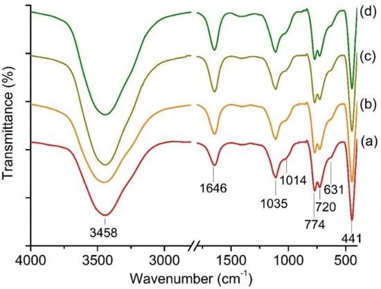 IR spectroscopy was used to study the framework stability of CP-x samples by examining their functional groups. In general, all samples displayed almost similar IR spectrum patterns as that of the theoretical pollucite solid, indicating that all samples retained their framework identity as also previously confirmed by the XRD study (Figure 5). The IR bands at 1014 and 1035 cm−1 are assigned to the internal vibrations of Si–O–T (T = Si, Al) asymmetric stretching modes while the signals resonated at 774, 720, and 631 cm−1 are the characteristics of distorted eight-membered ring sub-units present in the pollucite framework []. Furthermore, the IR band at 441 cm−1 is due to the bending vibration of TO4. On the other hand, two signals detected at 3458 and 1646 cm−1 are assigned to the stretching and bending vibrations of O–H groups of water, respectively []. As can be seen, the O–H bands become more intense with an increasing TPOAC concentration, indicating the hydrophilicity enhancement of the zeolites.