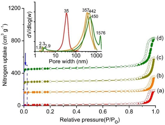The roles of TPOAC on the porous properties of Cs–pollucite nanozeolites were investigated with nitrogen adsorption-desorption isotherm analysis. CP-0 exhibited a type V adsorption isotherm with an H1 hysteresis loop (Figure 6a). Thus, it reveals the presence of cylindrical mesopores with a mean pore size distribution of ca. 35.0 nm (total average pore size is 31.7 nm) originating from the close packing of nanocrystals []. Neither the microporosity nor micropore volume were detected due to the smaller pore size of pollucite zeolite (σ = 2.43 Å) than the nitrogen molecular size (σ = 3.64 Å) [,]. As a result, only a fairly low external surface area (38 m2/g) and moderate total pore volume (0.29 cm3 g−1) were measured (Table 1). The adsorption isotherm slowly changed from type V to type IV when an increasing amount of N2 uptake was observed at low P/Po when more amount of TPOAC was added, indicating the development of hierarchical porosities (Figure 6b–d). This phenomenon is also supported by the pore size distribution analysis determined using the DFT method, where secondary porosities consisted of micro- and macroporosities were detected in CP-0.3, CP-1.0, and CP-2.0, with CP-2.0 having the largest accessible porosities (largest pore sizes) (inset of Figure 6). In addition, a significant increase in the SBET (contributed by both the micropore and external surface areas) and VTotal was also observed, particularly for CP-2.0 (SBET = 152 m2 g−1, VTotal = 0.63 cm3 g−1), thanks to the function of TPOAC as porogen, where the large amount of TPOAC added tended to form more micelles, which created micro- and macroporosities to the Cs–pollucite zeolites (Table 1) [].