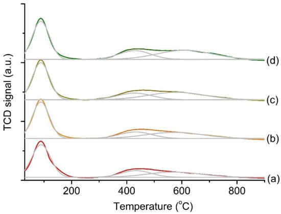 The surface basicity of Cs–pollucite samples was investigated with CO2-TPD analysis, where this analysis can accurately determine the distribution of basic strengths of a solid catalyst []. It was shown that CP-0 has the lowest number of basic sites (58.7 μmol g−1), where they are mostly contributed by the weak-to-mild basic sites (33.3 μmol g−1, 56.7%) (Figure 7a, Table 3). With the introduction of TPOAC into the hydrogel precursor of Cs–pollucite, the basicity (both in quantity and strength) increased thanks to the role of TPOAC as a porogen that develops more accessible porosities (Figure 7b–d). As can be seen, the total number of basic sites increased from 58.7 (CP-0) to 64.7 (CP-0.3) and 69.4 μmol g−1 (CP-1.0) before it further increased to 77.9 μmol g−1 (CP-2.0). Among the samples prepared, the basic strength of the solids follows this order: CP-2.0 > CP-1.0 > CP-0.3 > CP-0, where CP-2.0 has the largest number of mild-to-strong basic sites (27.3 μmol g−1).