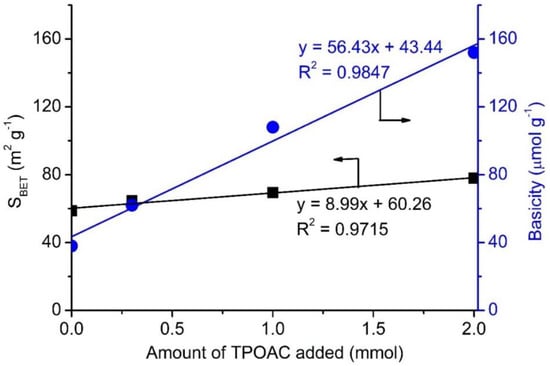 An attempt to correlate the surface basicity with the amount of TPOAC added and SBET was also made. Figure 8 shows the correlation plots between SBET, amount of TPOAC added, and the basicity of the Cs–pollucite samples. As shown, the basicity has a positive relationship with the TPOAC added, where the correlation is best described with a linear line, y = 8.99x + 60.26, with the best of fit, R2 = 0.9715. In addition, the SBET was also found to have direct influence on the basicity of the Cs–pollucite samples, where the relation can be described with a linear equation: y = 56.43x + 43.44, where R2 = 0.9847. For CP-0, which has the lowest SBET (38 m2 g−1), the basicity was found to be 58.7 μmol g−1. The basicity increased to 64.7 (CP-0.3), 69.4 (CP-1.0), and 77.9 μmol g−1 (CP-2.0) when the SBET of the solids increased. Thus, the results show that an addition of TPOAC in the synthesis of hierarchical Cs–pollucite is essential as it enhances the accessible surface area and surface basicity, where the basicity (number of basic sites) of Cs–pollucite, namely (Si-O-Al)−Cs+, is strongly associated with the total accessible surface area of the solids [].