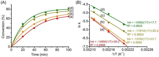 (A) Claisen–Schmidt condensation of benzaldehyde and acetophenone catalyzed with (a) CP-0, (b) CP-0.3, (c) CP-1.0, and (d) CP-2.0 nanocatalysts at 200 °C, where the respective Arrhenius linear plots are also shown in (B) using the second-order rate constants determined at 180, 190, and 200 °C.