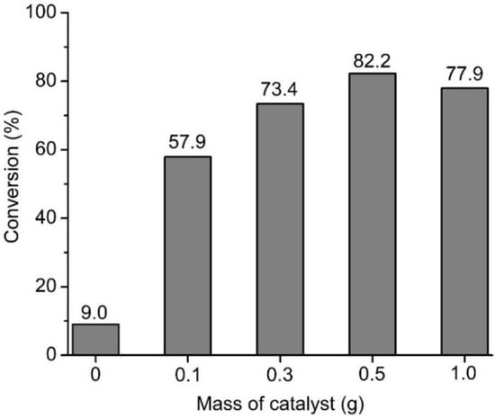 Catalyst loading plays an important role in the catalytic reaction [], and hence, it was studied in the range 0–0.10 g using the following conditions: 200 °C, 40 min, acetophenone:benzaldehyde molar ratio = 5 mmol:10 mmol. Only a 9.0% conversion was recorded when no catalyst was applied (Figure 10). The conversion, however, increased tremendously when CP-2.0 nanocatalyst was added. In general, the reaction conversion increased with the catalyst loading, where the highest reaction conversion (82.2%) was achieved by using 0.50 g of CP-2.0 catalyst. A slight decrease in the reaction conversion (77.9%), however, was recorded when 1.00 g of catalyst was used. This observation can be explained by the inhomogeneous mixing between reactants and catalyst as a result of the use of excessive catalyst that causes inefficient stirring. Hence, 0.50 g of CP-2.0 nanocatalyst was chosen for the further reaction study.