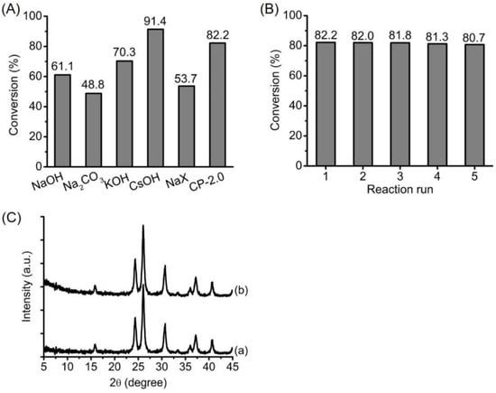 The catalytic performance of CP-2.0 was also compared with common homogeneous and heterogeneous catalysts, such as KOH, Na2CO3, NaOH, CsOH, and NaX zeolite, where an equimolar amount to CP-2.0 nanocatalyst was used; 1.984 mmol is equivalent to 0.50 g of CP-2.0 (Figure 12A). As expected, CsOH—an extremely alkaline metal hydroxide—showed the highest reaction conversion (91.4%) but the reaction was only 92% selective to chalcone due to the co-occurrence of a secondary Cannizzaro reaction of benzaldehyde to benzyl alcohol and benzoic acid, and slight product decomposition to non-identified compounds at the high temperature. Interestingly, no product decomposition was observed for the reactions catalyzed with other catalyst counterparts, where CP-2.0 displayed the second highest reaction conversion (82.2% conversion), followed by KOH (70.3%), NaOH (61.1%), NaX zeolite (53.7%), and Na2CO3 (48.8%). Although CsOH is the most reactive catalyst, it is less selective, hazardous, corrosive, and not reusable. In contrast, CP-2.0 is not corrosive. Hence, it can be easily handled and stored. Furthermore, CP-2.0 nanocatalyst has high catalyst reusability, where its crystallinity and catalytic reactivity were preserved even after five reaction runs (Figure 12B,C).