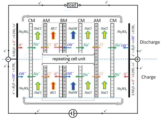 The main element of each repeating cell unit is the bipolar membrane. Under charge (lower half of Figure 1), a sufficiently high electrical potential has to be applied over the electrodes such that water is split inside the bipolar membrane into H+ and OH−. H+ and OH− combine with Cl− and Na+ from the adjacent salt chambers to produce HCl and NaOH, which can be stored in separate storage tanks. This corresponds to the well-established process of acid and base generation from salt solutions by electrodialysis with bipolar membranes [6]. The respective electrode reactions are water splitting under generation of OH− and of H2 at the negative electrode and with H+ and O2 generation at the positive electrode. The applied DC power supply transports electrons e− from the positive to the negative electrode.