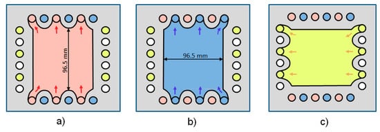 Figure 3 shows the flow through subsequent cell frames, (a) for up-flow of HCl, (b) for up-flow of NaOH and (c) for cross-flow of the NaCl solution. Together with the respective membranes, separated by rubber gaskets and grid spacers, the three frames form the repeating cell units shown schematically in Figure 1. The feed and exit flows of the respective electrolytes pass through the holes in the cell frames as indicated by the respective colors in Figure 3. All electrolytes are circulated by separate pumps from reservoirs through the respective compartments as indicated in Figure 2. Further details of the design are given in [8].
