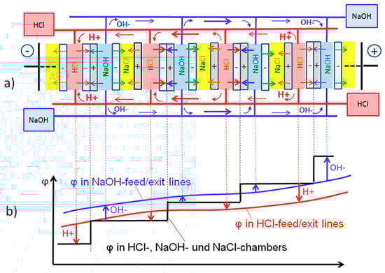 In Figure 5a only four repeating cell units in the middle of the stack are shown, together with their feed/exit lines for acid (red) and base (blue). At OCV, a voltage profile φ (black) develops across the stack as shown in Figure 5b. It mainly consists of the voltage steps in each of the bipolar membranes. The voltage gradient across the stack causes a counter-movement of H+ ions and of OH− ions along their feed/exit lines as indicated by the red and blue arrows in Figure 5a. The ions originate from the acid/base compartments at one side of the stack and turn back into the respective compartments at the opposite side. This leads to an ion flux maximum in the stack center. To ensure electroneutrality, the ion fluxes through the feed/exit lines have to be compensated by fluxes of opposite direction through the cell compartments. This leads to the indicated fluxes with neutralization of H+ and OH− inside the bipolar membranes, which is maximal in the middle of the stack. Comparable to a simple mixing of acid and base, this neutralization energy is converted into heat, representing a self-discharge with loss of electrical energy. The fluxes of H+ and OH− into the bipolar membranes have to be compensated by equivalent fluxes of Cl− and Na+ into the adjacent salt compartments.