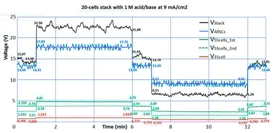 In the following, voltage measurements will be presented where Pt wire probes were positioned in the center of the 1st, the 2nd, the 6th, the 11th and the 19th acid cell of the stack. This allows measurement of the voltages across the 1st repeating cell unit, across the first five-cell unit (next to the electrode) and across the second five-cell unit (in the middle of the stack). In order to determine the total voltage of the 20-cell stack, the measured first cell voltage was added to the voltage measured between the first and the 19th acid compartment, assuming that the voltage across the repeating cell units next to both electrodes was equal.
