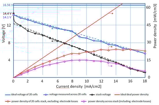 Considering an ideal behavior without losses across the stack (zero resistances) and with the theoretical single cell voltage of 0.828 V, a constant voltage of 16.56 V would result, leading to a linear increase of power density over current density, marked by the solid red line. The actually measured voltages across all 20 cells of the stack over current density lead to the power densities as displayed by the red line with measurement bullets. The losses partly result from the Ohmic resistances across the membranes and the electrolyte compartments, as already considered in the single-cell experiments in [2]. Another part results from the shunt currents, discussed in Section 3.2.