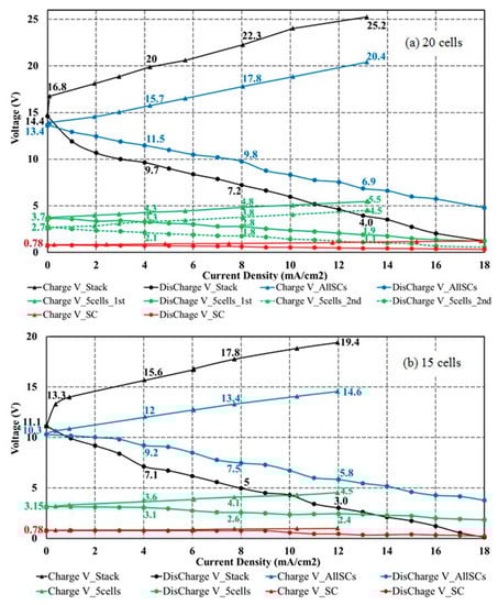 In Figure 8, measured voltages are presented for increasing current densities under charge (increasing voltages) and under discharge (decreasing voltages). At each current density, the measurement continued until a stable voltage was established. Figure 8a shows the results of a 20-cell stack and Figure 8b of a 15-cell stack, for 1M acid and base. Both results show the same general trends. The voltages measured across the electrodes of the whole stack are given by black dots and the measurements across all repeating cell units (excluding the electrodes) by blue dots. In addition, measurements across the first 5-cell unit (next to one electrode) are given by green solid lines and the measurements across the second 5-cell unit (in the middle of the stack) by green broken lines. Measurements for one repeating cell unit next to one electrode are displayed in red. If a shift of +0.7 V is imposed on the blue curves, as discussed before, the electrode losses between charge and discharge are about equal. They increase moderately with increasing current density.
