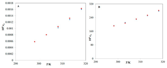 The mole fraction solubilities of FFA in pure water and pure Carbitol at five different temperatures, i.e., T = 298.2–318.2 K, have also been studied and reported in literature [4]. The graphical correlation of the xe value of FFA in pure water and pure Carbitol at T = 298.2–318.2 K is summarized in Figure 2A and B, respectively, showing a good correlation of xe data of FFA with those reported in literature. The RMSD values between the experimental and literature solubilities of FFA in neat water and neat Carbitol at five different temperatures were recorded as 2.21% and 1.22%, respectively. These results suggested good agreement of experimental solubilities of FFA with its literature values.