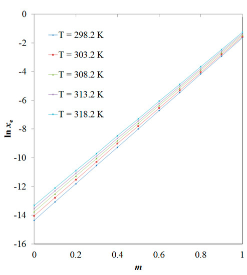 From the data summarized in Table 2, it was observed that the solubilities of FFA were found to enhance linearly with an increase in temperature and Carbitol mass fraction in all mixed solvent systems and pure solvents (p ˂ 0.05). Therefore, the maximum solubility of FFA was obtained in pure Carbitol (2.81 × 10−1 at T = 318.2 K), and the minimum one was found in pure water (5.80 × 10−7 at T = 298.2 K). The maximum solubility of FFA in pure Carbitol was probably due to the lower polarity and lower HSP of Carbitol compared with water [13,14,15]. The influence of Carbitol mass fraction on logarithmic solubility (ln xe) value of FFA at T = 298.2–318.2 K was also studied, and the results are presented in Figure 3.