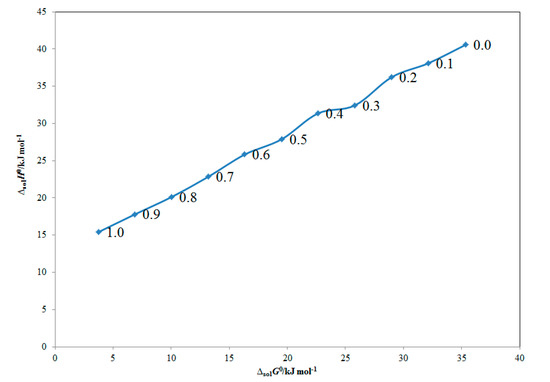 The solvation behavior of FFA in mixed solvent systems and pure solvents was investigated using enthalpy–entropy compensation analysis [12,32]. Such analysis was carried out by plotting the weighted graphs of ΔsolH° vs. ΔsolG° at Thm = 308 K [12].