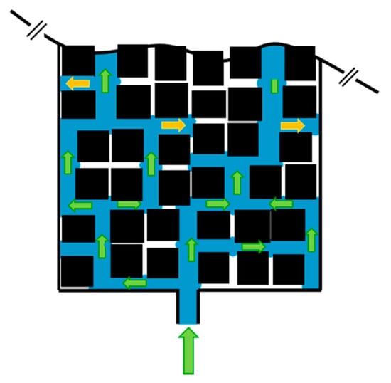 Schematic illustration of the impact of the pore structure on the transport properties. Solid spaces are indicated in black and pore spaces are indicated in white and blue, depending on the saturation with wetting and non-wetting phases. The blue phase (which is the wetting phase here) finds pathways through the larger connected pores (indicated by the green arrows), whereas stagnation (orange arrows) occurs in dead ends. The small pores remain uninvaded (shown in white).