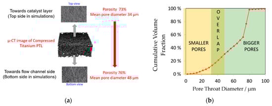 (a) Compressed titanium felt (from SylaTech Germany; dfibre = 20–45 µm, thickness 1.02 mm, original porosity 80%) after application at the anode in water electrolysis. The pore sizes at the top side are smaller than throughout the rest of the material. This results in different porosities at the top and bottom sides. The images were obtained from microcomputed tomography (CT-Alpha from Procon X-Ray GmbH, Sarstedt, Germany). (b) Cumulative volume fraction of measured pore sizes. The region denoted as “smaller pores” refers to the top side of the felt and the region denoted as “larger pores” refers to the bottom side, cutting the felt in half at its horizontal axis. Both layers have an overlap of pore sizes as indicated. PTL denotes the porous transport layer.