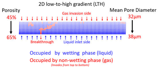 Visualization of the pore structure gradient in a 2D pore network. Here, the low-to-high (LTH) gradient is illustrated. It is shown how the structure can be occupied by gas (non-wetting) and liquid (wetting) phases simultaneously.