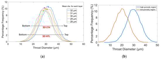 Visualization of the layered pore size distributions investigated in this study: (a) 3D low-to-high (LTH) and high-to-low gradients (HTL); (b) 3D dual-porosity network (only the curves of the two regions are shown). Note that a pore network slice is comprised of one horizontal layer of throats (in vertical and horizontal direction) and one pore layer. For this reason, the data points of only 5 slices are shown in (a) for the 3D pore network.