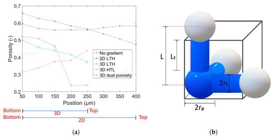 (a) Spatial variation of porosity in the 5 cases studied in this work. Only the porosity values of the slices in the center of the pore network are provided. (b) Graphical illustration of a volume element used for porosity computation. The blue cylinders and the sphere represent the throats and the pore that are accounted for the volume element, respectively. The white spheres represent the pore neighbors from the neighboring volume element. indicates the lattice spacing, is the throat length, and and are the throat radius and pore radius, respectively.