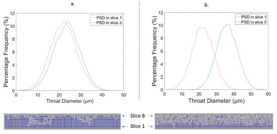 Besides the constant gradient of throat and pore sizes imposed on , with = 0.01 µm/µm for throat sizes and = 0.005 µm/µm for pore sizes (Figure 3), a dual-porosity network was realized (Figure 4 and Figure 5). Both examples result in overlapping of the throat and pore sizes of each layer, as illustrated in Figure 4 and Figure 5.
