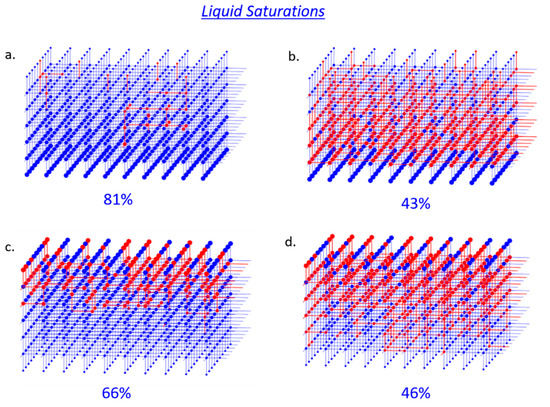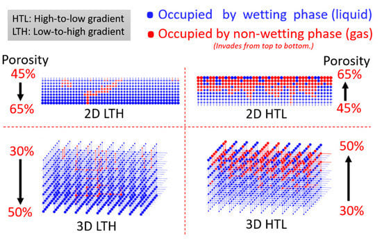 Figure 7 summarizes the invasion profiles for 4 different gradients at breakthrough of the gas phase for both 2D and 3D simulations based on the parameters given in the previous section. In the LTH case, the larger pores are located at the bottom side. In this situation, invasion is favored towards the bottom of the network because of the lower invasion pressure thresholds that can be computed from Equation (1). Compared to the HTL simulation, the LTH is characterized by an invasion pattern such as viscous fingering [] in both 2D and 3D simulations. Breakthrough of the gas phase occurs with a significantly lower number of invasions steps. This means that the final saturation with the gas phase at the breakthrough point is lower than compared to the HTL simulation, where the larger voids are located at the top side. In contrast to LTH, in HTL the top side is favorably invaded. Thus, in the case of HTL, the invasion results in the formation of a gas–liquid distribution, similarly as for stable displacement with a flat invasion front []. This is again observed in 2D and 3D simulations. However, the stabilization is more significant in 2D due to the lower pore connectivity.