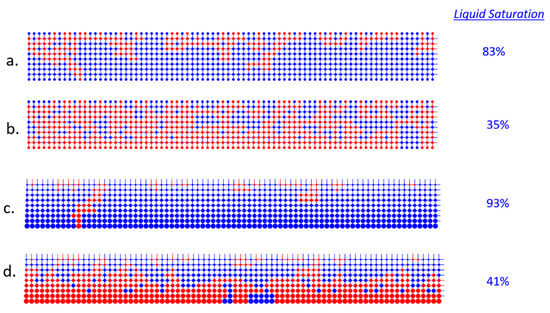 Phase patterns of (a) the LTH gradient at the breakthrough point, (b) the LTH gradient at the water disconnection point, (c) the HTL gradient at the breakthrough point, and (d) the HTL gradient at the water disconnection point. Note that the bottom rows (first pore and throat layers) are not invaded due to the applied cluster labeling rules. Due to this, breakthrough denotes the invasion of the first pore in the second pore row. The figures in (a–d) are from one pore–throat configuration for each case. The saturation values denote the percentage of saturation with the liquid phase.
