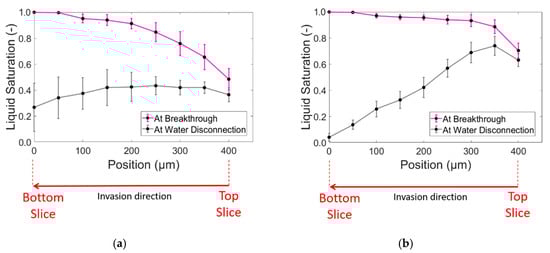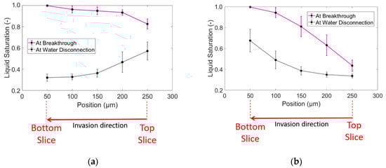 Saturation profiles summarized for (a) LTH and (b) HTL 3D simulations. The graphs were obtained from Monte Carlo simulation of 15 variations of the pore networks using the simulation parameters summarized in Table 1.
