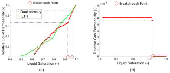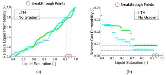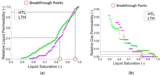 Comparison of (a) relative liquid and (b) gas permeabilities of LTH and HTL 3D pore networks corresponding to Figure 11. The breakthrough points denote the breakthrough of the gas phase to the second pore row of the pore networks. The absolute permeabilities computed for the empty networks are = 1.24 × 10−12 m2 (LTH) and = 1.38 × 10−12 m2 (HTL).