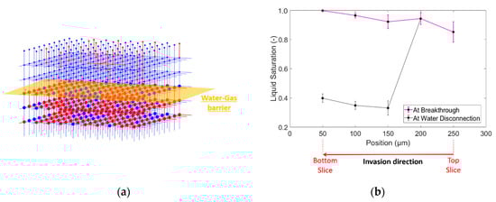 In the pore network without a gradient, the final liquid distribution is almost uniform across the height of the network (Figure 9; the low saturation at the bottom is explained by invasion rules and determination of liquid cluster labels []). In contrast, in the LTH pore network, a distinct watershed evolves in the center of the pore network, separating the gas and liquid phases. This is explained by the throat size distribution and the favorable invasion of larger throats in hydrophilic drainage.