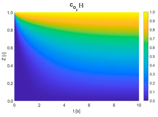 Dynamics of the normalized oxygen concentration profile in the liquid phase. Here, denotes the dimensionless concentration of oxygen in the vertical direction, z is the space coordinate, and t is the time.
