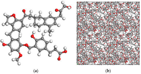 In the past few decades, scholars have proposed many coal molecular models. In this paper, the Wender coal model was used to represent low-rank coal [27]. It contains the common oxygen-containing functional groups in coal. The Wender coal model is presented in Figure 1 and the Mulliken charges of each atom are given in Figure S1. The molecular model of coal surface constructed in past research is often irregular. In the later analysis of the simulation results, it is difficult to extract some parameters, such as the thickness of the water layer, the concentration distribution of water molecules in the direction perpendicular to the surface, etc. In order to construct a smooth coal surface structure, the following operations were performed. The constructed process of a basic rectangular coal cell with the density of 1.0 g/cm3 can be found in our previous study [1]. Then, graphite sheets were added on each side of the coal molecule along the Z-axis direction, as shown in Figure 2. Fixing the graphite atoms and minimizing the system using geometry optimization in Forcite module, coal molecules were gradually compressed due to the effect of graphite, forming a smooth surface. We repeated the above steps until the density of coal molecules reached 1.2 g/cm3. Finally, we removed the graphite sheet. The size of the simulation cell was 64 × 64 × 150 Å3 with the angles of 90° × 90° × 90°. As shown in Figure 2, there were 96 oxygen atoms, including carboxyl, hydroxyl, carbonyl, and ether groups, and 413 carbon atoms on the surface, indicating that the surface was strongly hydrophilic. The Wender coal molecule and the top view of the coal surface model used in this paper are shown in Figure 1. The Mulliken charge of each atom was calculated using density functional theory (DFT) method by Dmol3 module in MS 8.0, and the values are given in Figure 1a. The density of the coal molecules can be calculated according to Equation (1).