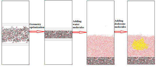 In recent years, with the rapid development of computer simulation technology, molecular simulation has become an effective means for investigating adsorption processes and the interfacial interaction in flotation [5,23,24,25,26]. Xia et al. carried out molecular dynamics simulations (MD) to study the adsorption process of dodecane on low-rank coal in the presence of DTAB. The simulation results were consistent with the experimental results [13]. Pores on low-rank coal surface also affect the adsorption process of water and collectors, which was studied in our previous work [1]. Molecular simulation technology can allow us to understand some phenomena which cannot be observed in experiments from the molecular level and can better explain some macroscopic experimental results. Besides, the results of molecular simulation can provide guidance for our experimental research.