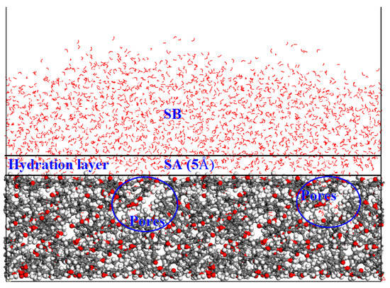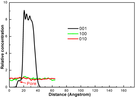 The dynamic simulation results of CW are presented as Figure 4. As shown in Figure 4, water molecules were mainly located near the surface of coal molecules due to the attraction of coal molecules. The relative concentration distribution (RCD) of water molecules is shown in Figure 5. The distribution of water molecules in X and Y directions was uniform. However, in the vertical direction from the surface of the coal molecule, the RCD of the water molecule had three peaks. This indicated that the hydrophilic group in the coal molecule interacted with the water molecule, forming a hydration layer with a high concentration of water molecules. In addition, in the vertical direction, there was a peak value of RCD near 13 Å. Combined with the coal surface model, it was found that there were some pore structures at this position. Water molecules could enter these pores and promote the formation of the hydration layer on the coal surface [32,33].