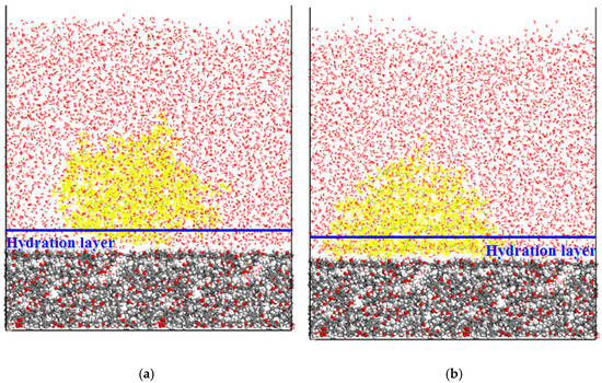 Initial and final configurations of the CWC adsorption system under different condition are presented in Figure 8 and Figure 9. It can be seen from Figure 8b that dodecane molecules could not be adsorbed on the coal surface, and the dodecane molecules were kept agglomerated together during the whole simulation process. This was because, in the initial state (Figure 8a), the dodecane molecules were about 35 Å away from the coal surface, and the dodecane molecules could not break through the hydration layer formed by the surface water molecules. However, it can be seen from Figure 9b that a large number of dodecane molecules adsorbed the coal surface. This was because, in the initial state, the collector molecule was close to the coal surface (less than 5 Å), the thickness of the hydration layer was 5 Å, and the collector molecule was already located in the inside of the hydration layer, thus it could be successfully adsorbed on the coal surface.