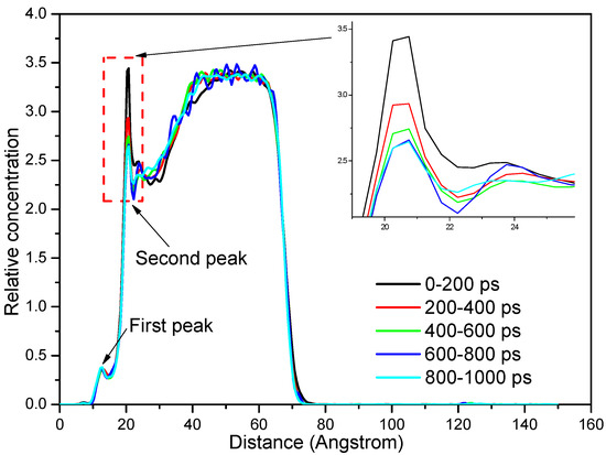 It can be seen from Figure 10 that there were two peaks at 13 Å and 21.5 Å. The first peak value was caused by the water molecules adsorbed in the pores of coal, which was consistent with the results of Section 3.2.2, indicating that the addition of dodecane molecules would not affect the adsorption morphology of water molecules in pores. The second peak was due to the water molecules adsorbed on the coal surface (hydration layer). With the increase of simulation time, the collector gradually adsorbed on the coal surface and began to spread, pushing away the water molecules near the coal surface. As a result, the RCD of water molecules on the coal surface decreased gradually. In the initial 200 ps, the RCD of water molecules decreased rapidly. After 600 ps, the RCD of water molecules in the system remained stable, indicating that the system had reached the equilibrium state.