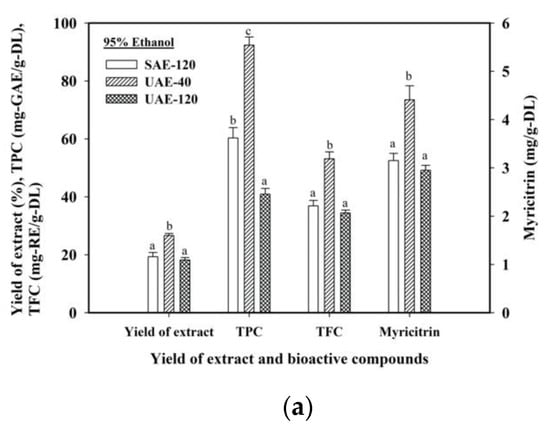 Comparison of the yield of extract, total phenolic content (TPC), total flavonoid content (TFC), and myricitrin between UAE-40, UAE-120, and SAE-120 with (a) 95% ethanol, (b) water, and (c) methanol as the solvent. Conditions: DL/solvent = 1/10 (g/mL), 30 °C, 4 h. Data were expressed as mean ± standard deviations from triplicate experiments. Different superscript letters at the same group were significantly different (p < 0.05) using the Duncan’s multiple range test. Abbreviations: defatted leaves (DL), gallic acid equivalent (GAE), and rutin equivalent (RE).
