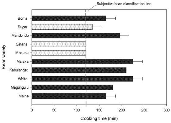 The result of the subjective finger-pressing test is shown in Figure 1. The results showed that without any softening technique employed, cooking of common beans will take 2–4 h, depending on the cultivar. Using the locally accepted cooking time classifier of two hours (designated as “subjective bean classification line” in Figure 1), the bean varieties were classified as either easy-to-cook beans (ETC) or as hard-to-cook (HTC). The plot shows that Masusu, Satana, and Sugar beans could be classified as ETC. These results confirmed what the communities had known for years. These varieties sell quickly in the communities because they are cooked in a relatively shorter time and required less fuel. Other cultivars, including Maine, Magungulu, White, Kabulangeti, Mandondo, Boma, and Msiska beans, classified as hard-to-cook (HTC), take up to 4 h to be fully cooked.