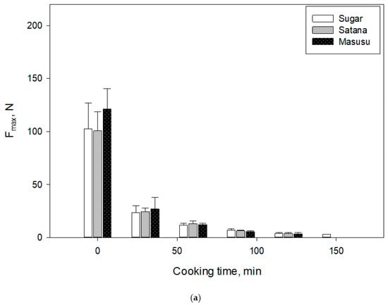 The cooking profile of the common beans by the objective compression test showed that the maximum force showed similar categorization as the pinching test classifying Masusu, Satana, and Sugar beans as ETC (Figure 2a) and the other cultivars as HTC (Figure 2b). The average hardness of raw dry ETC and HTC beans was 102.4 and 170.8 N, respectively. Reduction in hardness was observed in the first 30 min of cooking for all the cultivars. In the ETC cultivars, the average hardness reduction was 77%, while 87% was recorded for the HTC cultivars. Nevertheless, the ETC reached their cooking texture much faster. Among the HTC cultivars, White and Msiska cultivars took the longest time to cook. This may not be unexpected as their average hardness in the dry unsoaked state was 36–47% higher than all the ETC beans. When compared to the other HTC cultivars, the average hardness was 16–36%. This can be attributed to the inherent seed characteristics such as cell wall structure, seed composition, and compactness of cells in the seeds [25,26].